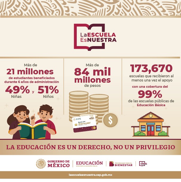 Ciudad de México, 06 de Enero de 2025.- Durante 2025, el gobierno federal prevé destinar 25 mil millones de pesos al programa La escuela es Nuestra que en este año se ampliará para abarcar a los planteles de la educación media superior, informó Pamela López, directora general del Programa. Se tiene previsto una inversión de 19 mil 900 millones de pesos a las 67 mil escuelas de educación básica y 4 mil 200 millones de pesos a los planteles del nivel medio superior.