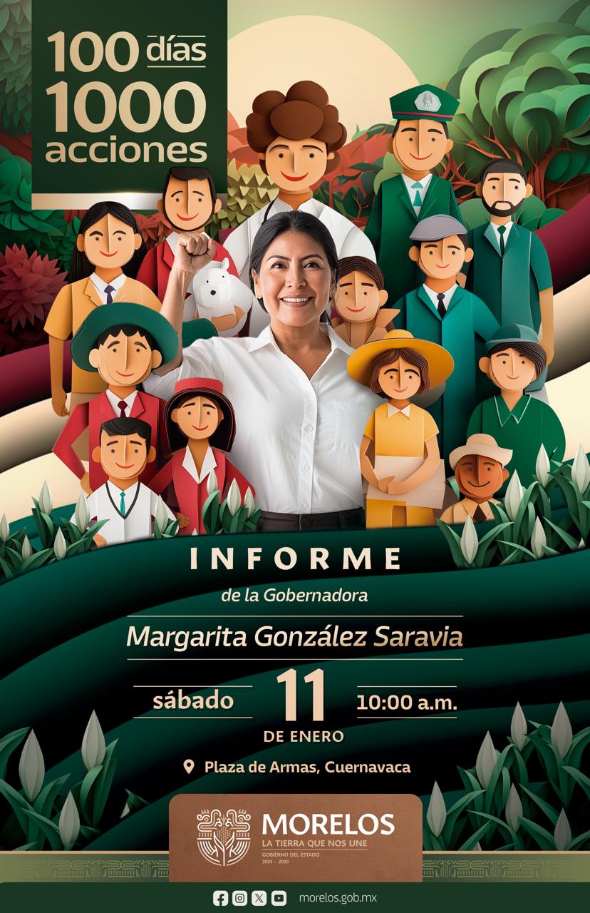 Morelos, 07 de Enero de 2025.- En un ejercicio de transparencia y de rendición de cuentas, Margarita González Saravia, primera mujer gobernadora en la historia del Estado, dará un mensaje al pueblo de Morelos, con motivo de los primeros 100 días de trabajo; el encuentro con su gente será el próximo sábado 11 de enero a las 10:00 de la mañana, en la Plaza de Armas “General Emiliano Zapata Salazar”, en Cuernavaca.