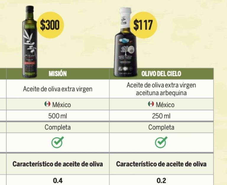 Así, la dependencia encontró que uno de los mejores aceites de oliva es el de la marca «Misión», en su presentación como «aceite de oliva extra virgen». La Profeco precisó que este aceite es hecho en México y tiene un precio de 60 pesos por cada 100 mililitros del producto. La dependencia indicó que este producto tiene un nivel de acidez libre de 0.4 gramos por cada 100 gramos; cabe mencionar que cuanto menor sea la acidez, mejor es la calidad del aceite de oliva.