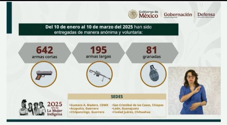 En la presentación del informe quincenal de seguridad, señaló que en la campaña de “Sí al desarme Sí a la paz” del gobierno de México y la Iglesia católica desde el 10 de enero a la fecha en 6 municipios han intercambiado de manera voluntaria y totalmente anónima, 642 armas cortas, 195 armas largas y 81 granadas.