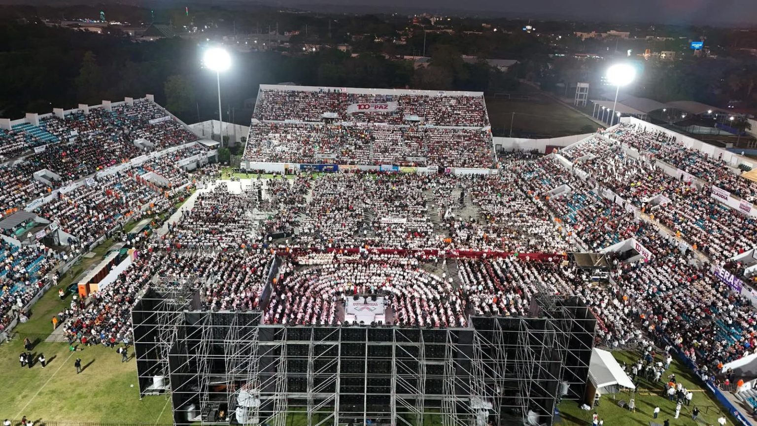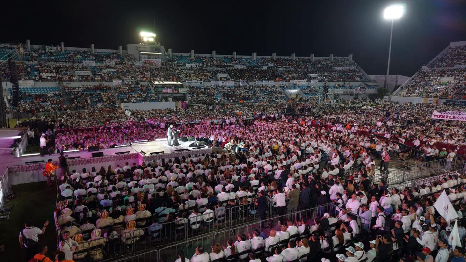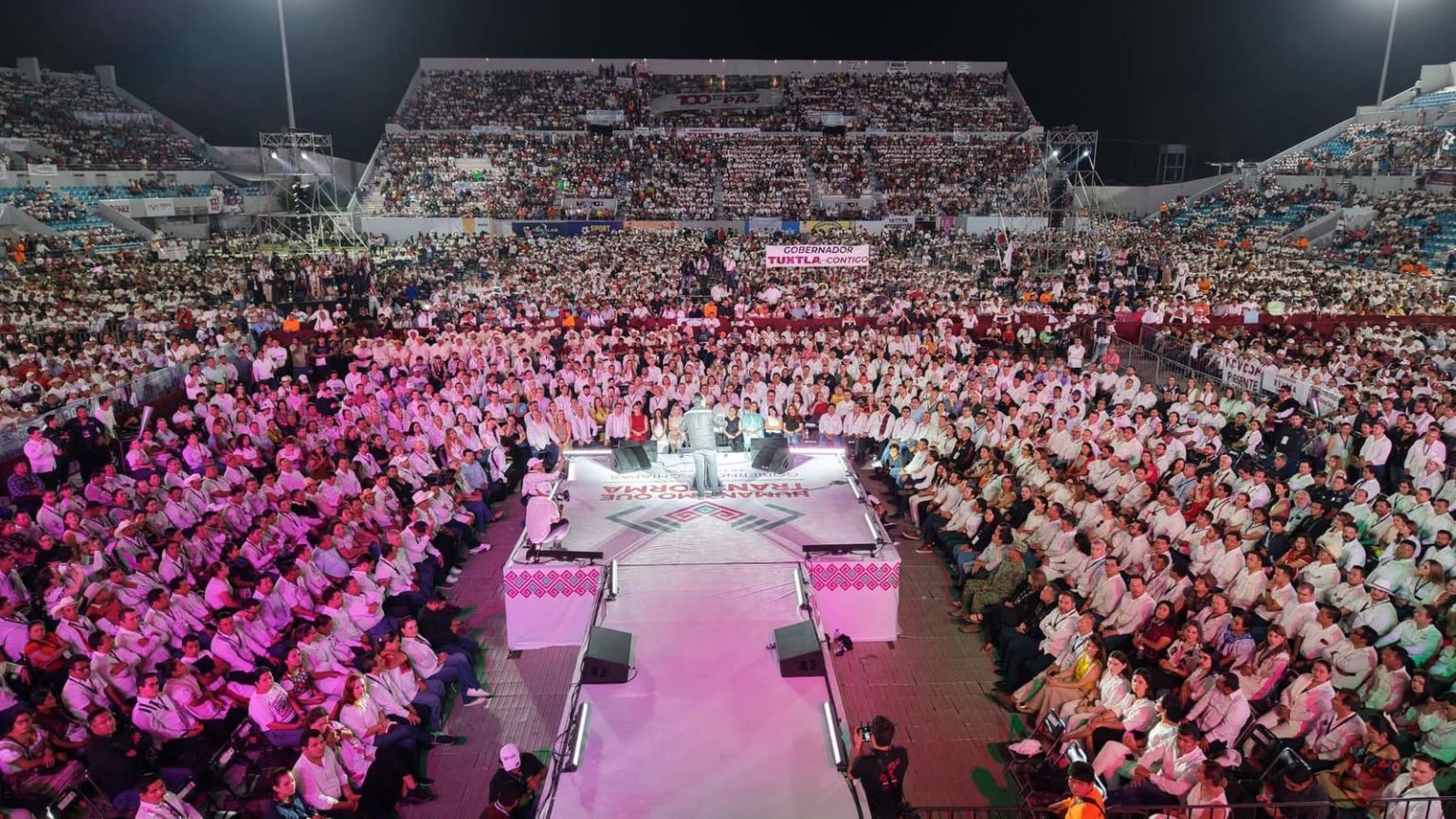 Chiapas, 17 de Marzo de 2025.- El Estadio Olímpico de Tapachula se convirtió en el epicentro de una noche inolvidable, donde el gobernador Eduardo Ramírez Aguilar presentó los logros alcanzados en los 100 primeros días de su administración. Un ambiente festivo envolvía el lugar: mensajes de agradecimiento destacaban entre la multitud y miles de voces se unían en una sola exclamación: “¡Gobernador, gobernador!”