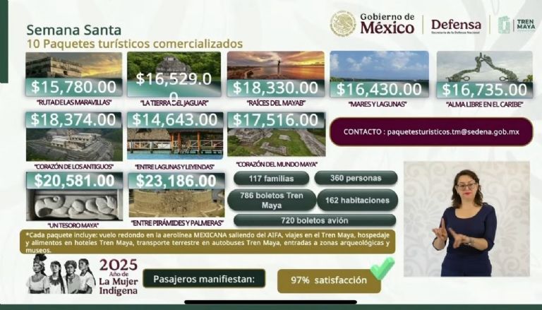 Para el periodo vacacional de Semana Santa 2025, la empresa Tren Maya lanza 10 paquetes turísticos comercializados. En conferencia de prensa, Óscar David Lozano Águila, director general del Tren Maya, detalló que cada uno de ellos incluye vuelo redondo en la aerolínea Mexicana saliendo del AIFA; viaje en el Tren Maya, así como hospedaje y alimentos, transporte terrestre en autobuses, entradas a zonas arqueológicas y museos.