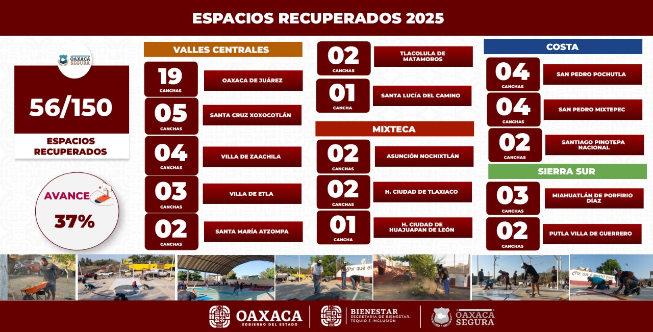 Durante la conferencia de prensa del Gabinete de Seguridad, la Subsecretaria de Tequio e Inclusión para el Bienestar, Fernanda Schmidt Ruiz dio a conocer que, durante este año, se rescatarán un total de 150 espacios, de los cuales, 56 ya han sido intervenidos en las regiones Valles Centrales, Costa y Sierra Sur.