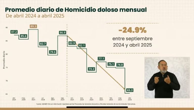 “Al cierre de abril, podemos informar que este mes cerró con un promedio mensual de 65.3 homicidios diarios. Si comparamos este promedio con el que se tenía al inicio del gobierno de la presidenta, la doctora Claudia Sheinbaum, que era de 86.9 homicidios diarios, en siete meses, se ha tenido una reducción del delito de homicidio doloso a 24.9 por ciento”, afirmó.