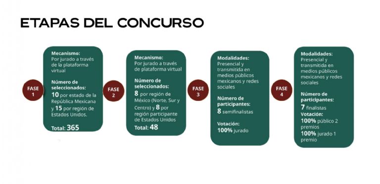 La funcionaria general precisó que serán 365 seleccionados y que a partir del 5 de julio arranca la segunda etapa, y la final se realizará el 5 de octubre en modalidades presencial y transmitida medios de públicos mexicanos y redes sociales.