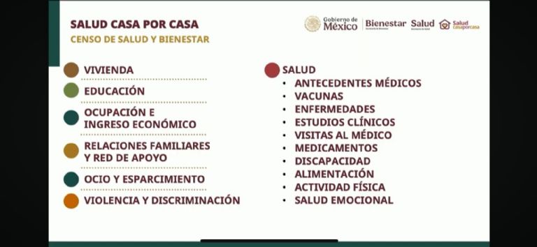 “Los antecedentes médicos de ellos y sus familias, con qué vacunas cuentan principalmente ahora el Covid, qué enfermedades padecen, estudios clínicos que se hayan realizado o que tengan pendientes, cuántas visitas al médico realizan y dónde se atienden, qué medicamentos consumen, si viven con discapacidad en el caso de los adultos mayores, las personas con discapacidad, ya conocemos su condición, cómo es su alimentación, qué actividad física realizan y también una serie de preguntas sobre salud emocional”, refirió.