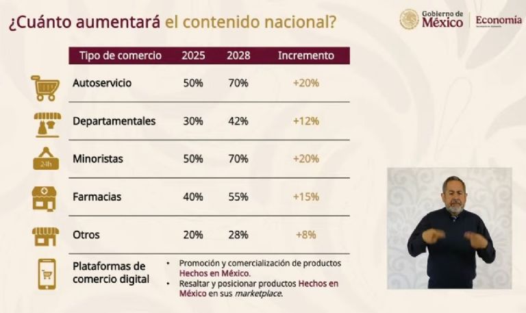 El Gobierno de México firmó con 22 grupos empresariales el “Acuerdo Voluntario para el Aumento de Contenido Nacional” en tiendas de autoservicio, de conveniencia, farmacias, plataformas, pequeños comercios, entre otras. En la conferencia de prensa matutina, la presidenta Claudia Sheinbaum Pardo dijo que este acuerdo es parte del Plan México con el objetivo de aumentar el porcentaje de productos que se fabrican en México en la comercialización.