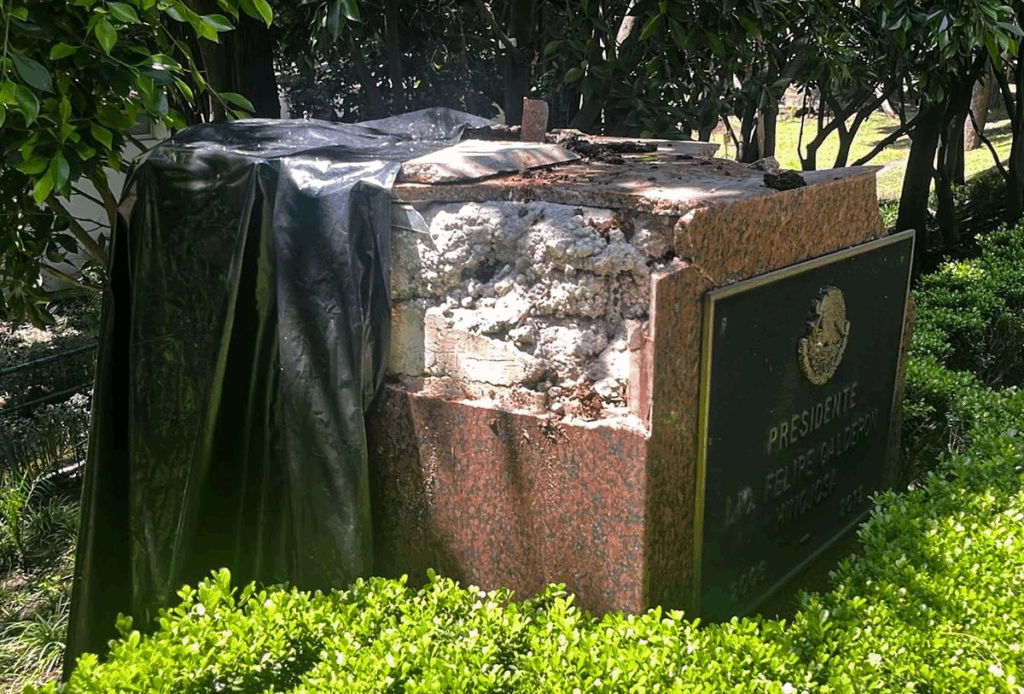 Un árbol derribó desde el pasado viernes la estatua del ex presidente Felipe Calderón Hinojosa en el Centro Cultural Los