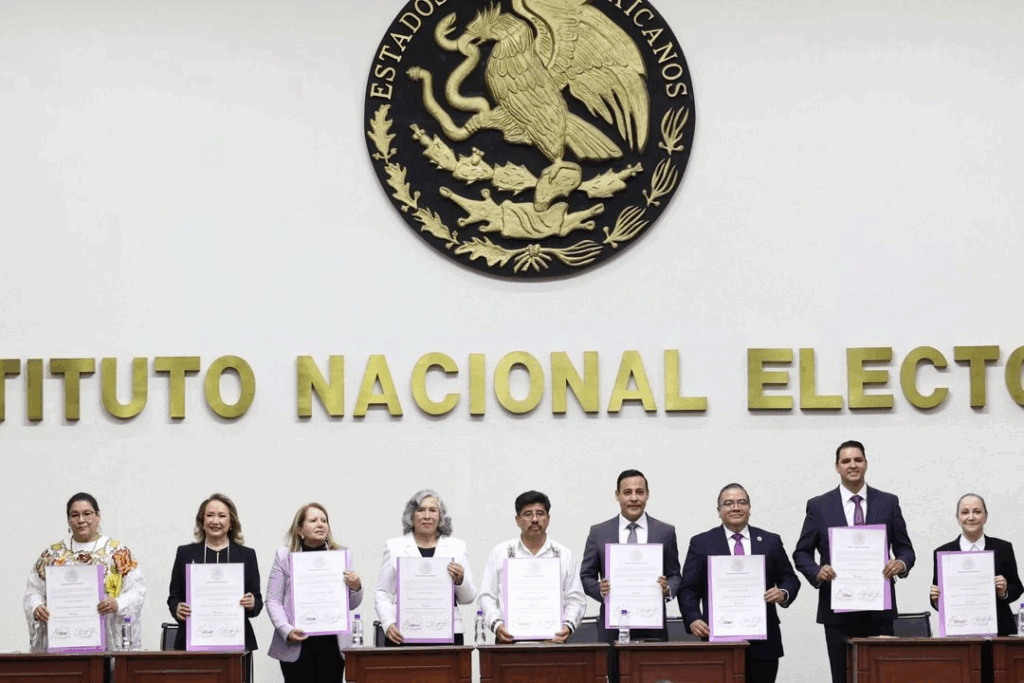 En la parte más alta del salón de sesiones del Instituto Nacional Electoral (INE), los nueve ministros electos recibieron las